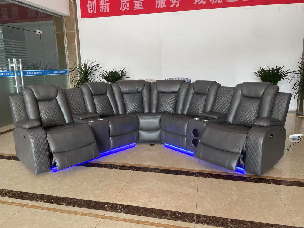 Elevate your living space with the Little Boy Power Reclining Sectional, featuring durable Gel Leatherette upholstery and high-density foam for lasting comfort. Choose from sleek Black or rich Brown. Enjoy an immersive entertainment experience with built-in LED lights and Bluetooth speakers. This sectional offers both comfort and convenience with two power reclining seats on each end, two storage consoles with cupholders, and USB charging ports.